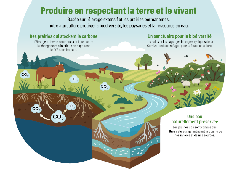 En maintenant ces prairies grâce à l’élevage, l’agriculture corrézienne agit comme un puits de carbone naturel, contribuant concrètement à l’atténuation du changement climatique.